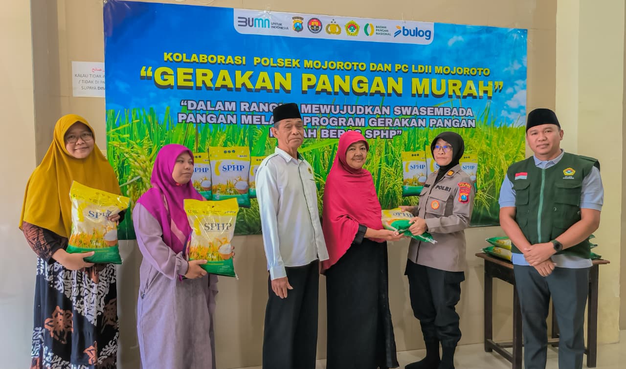 Kediri (12/11). Untuk mendukung program pemerintah menjaga stabilitas pasokan dan harga pangan, Polsek Mojoroto bekerja sama dengan PC LDII Kecamatan Mojoroto menggelar Gerakan Pangan Murah beras SPHP di Pondok Pesantren Nurul Hakim Al Fatah, Kota Kediri.